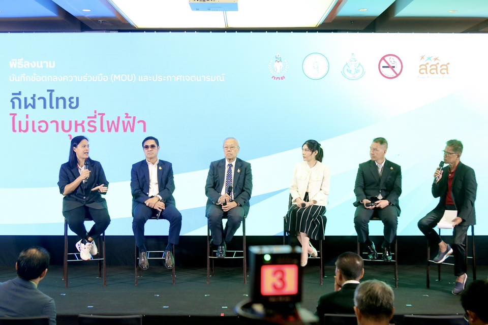 สำหรับพิธีลงนามบันทึกข้อตกลงความร่วมมือ (MOU) และประกาศเจตนารมณ์ “การกีฬาไทยไม่เอาบุหรี่ไฟฟ้า” ในครั้งนี้ มีการเสวนาในหัวข้อ “การสูบบุหรี่และบุหรี่ไฟฟ้ามีผลกระทบต่อนักกีฬาอย่างไร” จัดโดย สมาคมกีฬาแห่งจังหวัดกรุงเทพมหานคร ร่วมกับ มูลนิธิรณรงค์เพื่อการไม่สูบบุหรี่ และสำนักงานกองทุนสนับสนุนการสร้างเสริมสุขภาพ (สสส.) โดยให้ความรู้ถึงโทษของนิโคตินในบุหรี่และบุหรี่ไฟฟ้าที่ส่งผลกระทบต่อสมรรถภาพ สุขภาพ และศักยภาพของนักกีฬาไทย ซึ่งเป็นเรื่องสำคัญที่ทุกภาคส่วนต้องช่วยกันรณรงค์ ต่อไป