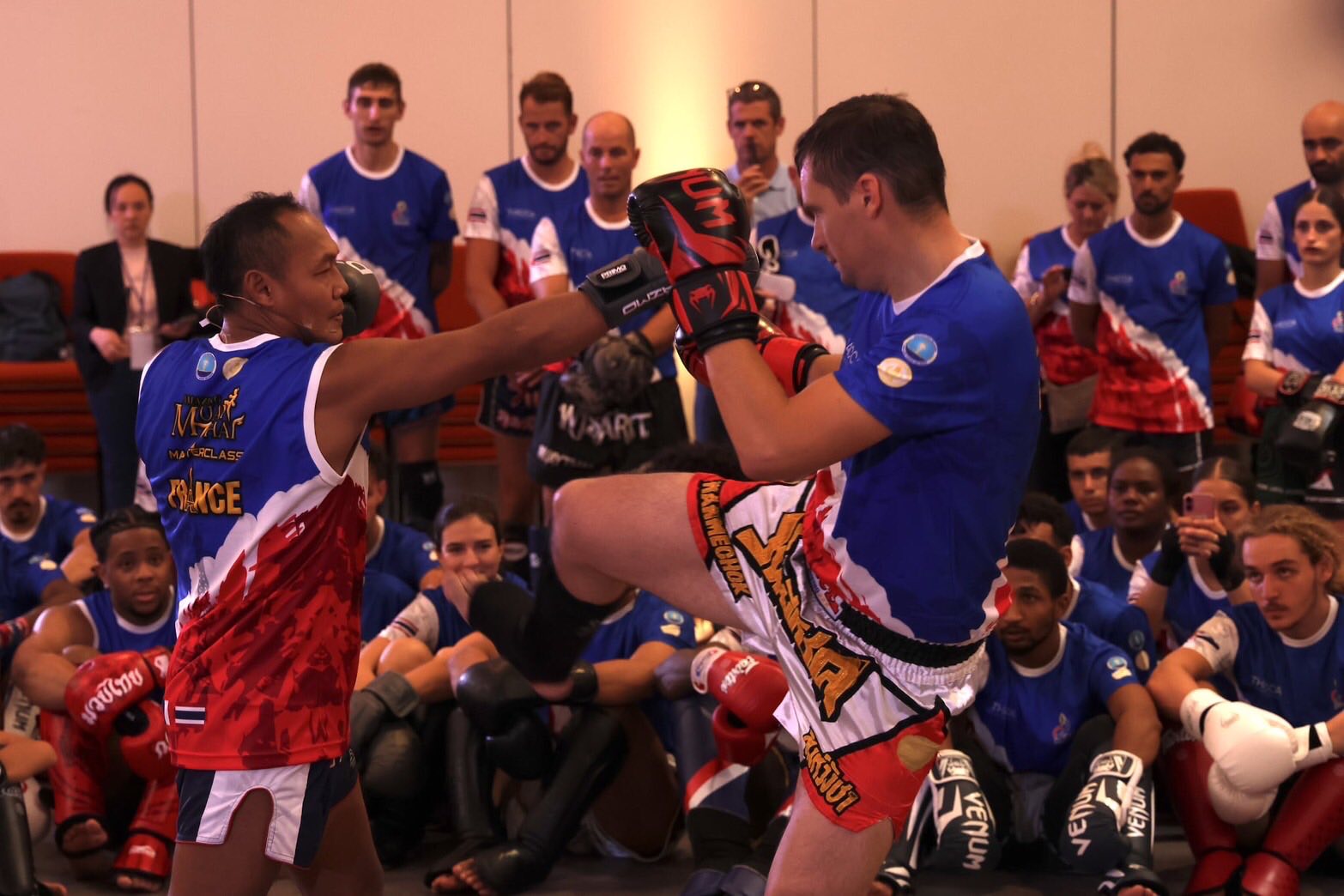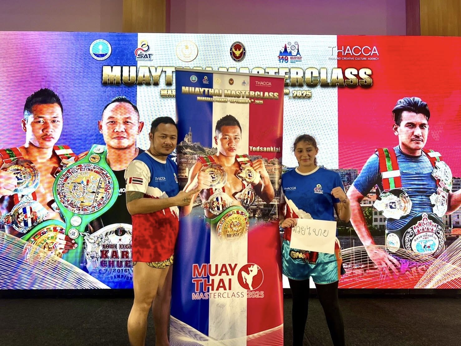 สุดคับคั่ง ชาวฝรั่งเศสกว่า 400 คน ร่วมกระทบไหล่ “แสนชัย-ยอดแสนไกล-นำศักดิ์น้อย” ในโครงการ “Muaythai Masterclass 2025“ เมืองมาร์กเซย ประเทศฝรั่งเศสความเคลื่อนไหว โครงการ “มวยไทย มาสเตอร์ คลาส 2025” (Muaythai Masterclass 2025) ซึ่งจัดโดย คณะอนุกรรมการขับเคลื่อนอุตสาหกรรมด้านกีฬา ภายใต้สำนักงานส่งเสริมวัฒนธรรมสร้างสรรค์ ร่วมกับ สำนักงานคณะกรรมการกีฬามวย การกีฬาแห่งประเทศไทยล่าสุดยกทัพไปยังเมืองมาร์กเซย ประเทศฝรั่งเศสโดยพิธีเปิดได้รับเกียรติจาก นางสาวธิดา สุขีลาภ อุปทูต สถานเอกอัครราชทูต ณ กรุงปารีส เป็นประธานในพิธี พร้อมด้วย นายธีรวัฒน์ ศิลปอาชา ผู้อำนวยการกองส่งเสริมพัฒนากีฬามวย การกีฬาแห่งประเทศไทย และคณะ เข้าร่วมที่ออเรนจ์ เวลโลโดรมจากนั้น 3 ยอดนักชกมวยไทย แสนชัย พี.เค.แสนชัยมวยไทยยิม, ยอดแสนไกล แฟร์เท็กซ์ และ นำศักดิ์น้อย ยุทธการกำธร มาร่วมโชว์การไหว้ครูมวยไทย พร้อมถ่ายทอดประสบการณ์เปิดคลาสสอนมวยไทยให้กับชาวฝรั่งเศสที่ชื่นชอบกีฬามวยไทย และผู้สนใจร่วมลงทะเบียนเข้าร่วมงานเกือบ 400 คน โดยแฟนๆ มวยท้องถิ่นทุกเพศทุกวัยต่างพกอุปกรณ์และชุดซ้อมมวยมาครบชุดนอกจากนี้ภายในงานยังมีการประชาสัมพันธ์การอำนวยความสะดวกด้านการเดินทางเข้าสู่ประเทศไทย ด้วยการให้คำแนะนำการขอวีซ่า Non-Immigrant Visa (ED) 90 วัน และ Muaythai DTV (Destination Thailand Visa) 180 วัน สำหรับผู้ที่สนใจเรียนมวยไทยระยะยาวอีกด้วยกิจกรรมครั้งนี้จะเป็นช่องทางในการสร้างแรงบันดาลใจให้ชาวฝรั่งเศส ได้ลงทะเบียนเดินทางมาเรียนมวยไทยในค่ายมวยมาตรฐานของประเทศไทย เพื่อสร้างงาน สร้างอาชีพ สร้างรายได้ สู่การเพิ่มมูลค่าเศรษฐกิจ และเชื่อมต่อกับอุตสาหกรรมต่าง ๆ ทั้งในระดับท้องถิ่นและระดับประเทศต่อไปล่าสุด นางสาวธิดา สุขีลาภ อุปทูต สถานเอกอัครราชทูต ณ กรุงปารีส ระบุว่า ”ก็รู้สึกยินดีเป็นอย่างยิ่ง เห็นจำนวนคนเข้าร่วมก็น่าจะประมาณ 300 กว่าคนขึ้นไป ก็มีทุกเพศทุกวัย นั่นสะท้อนให้เห็นว่ามวยไทยเป็นที่นิยมมากขึ้นเรื่อยๆ จริงๆ ก็เป็นที่นิยมมาแล้วพอสมควร แต่ว่าดูจากจำนวนความนิยมของคนฝรั่งเศสก็ถือว่าประสบความสำเร็จในการเผยแพร่ซอฟพาวเวอค์ของมวยไทย“