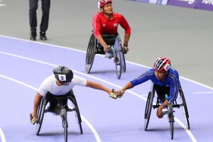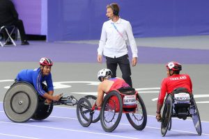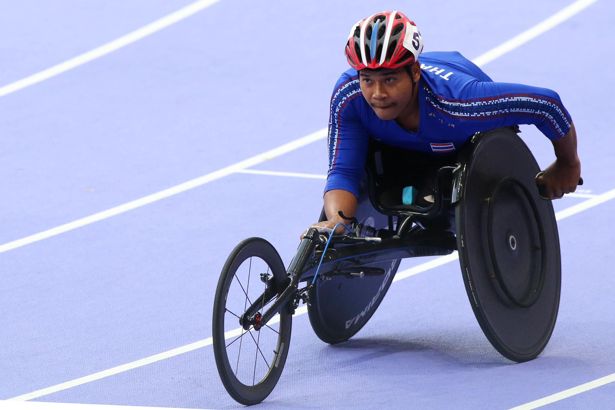 พงศกร แปยอ นักวีลแชร์เรซซิ่ง หนุ่มไทย เร่งสปีดเต็มกำลังก่อนเข้าเส้นชัย เป็นอันดับที่ 2 ด้วยเวลา 14.66 วินาที คว้าเหรียญเงินไปครอง ในการแข่งขันวีลแชร์เรซซิ่ง 100m T53 กีฬาพาราลิมปิกเกมส์ ครั้งที่ 17 กรุงปารีส ประเทศฝรั่งเศส เมื่อวันพุธที่ 4 กันยายน ที่ผ่านมา